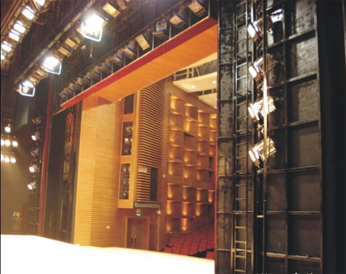 1.設置于舞臺臺口內側的假臺口,由上片和兩側片組成。通過上片和側片位置 的變化,可以調整舞臺開口的大小,即可以將開口縮減。2.假臺口上片和兩側片鋼結構形式要便于安裝舞臺燈具。同時為固定設置追光 燈提供便利,可上人操作使用燈具。3.假臺口上片由電動提升或下降,側片為手動平移并設有導向裝置。 4.假臺口上片、側片分別由帶導軌的鋼制框架,驅動系統和控制系統構成。設有備用系統,可以手動操作復位。 具體由下述部分組成: ·上片為兩層鋼制框架,兩端設有常閉式防護門,并通過"碼頭"與天橋相連。 側片為多層鋼制框架。操作面應敷設絕緣防滑橡膠板和踢腳板。 ·上片的卷揚系統由電動機、減速器、兩個獨立的制動器、卷筒等組成。側 片驅動機構由行走輪、導向系統等組成。 ·導軌 ·滑輪組件 ·上片用平衡重時、應設平衡重架、導軌和防護網 ·鋼絲繩和配件 ·有提升、下降和緊急停車按鈕的操作盤可以實現就地操作。應與其它相關 設備和安全防護門動作聯鎖。 5.為燈光、音響電纜進入假臺口提供良好的條件和必要的裝置。渡橋的兩側應 便于安裝燈具,設垂直電纜收納裝置和水平電纜布線裝置。